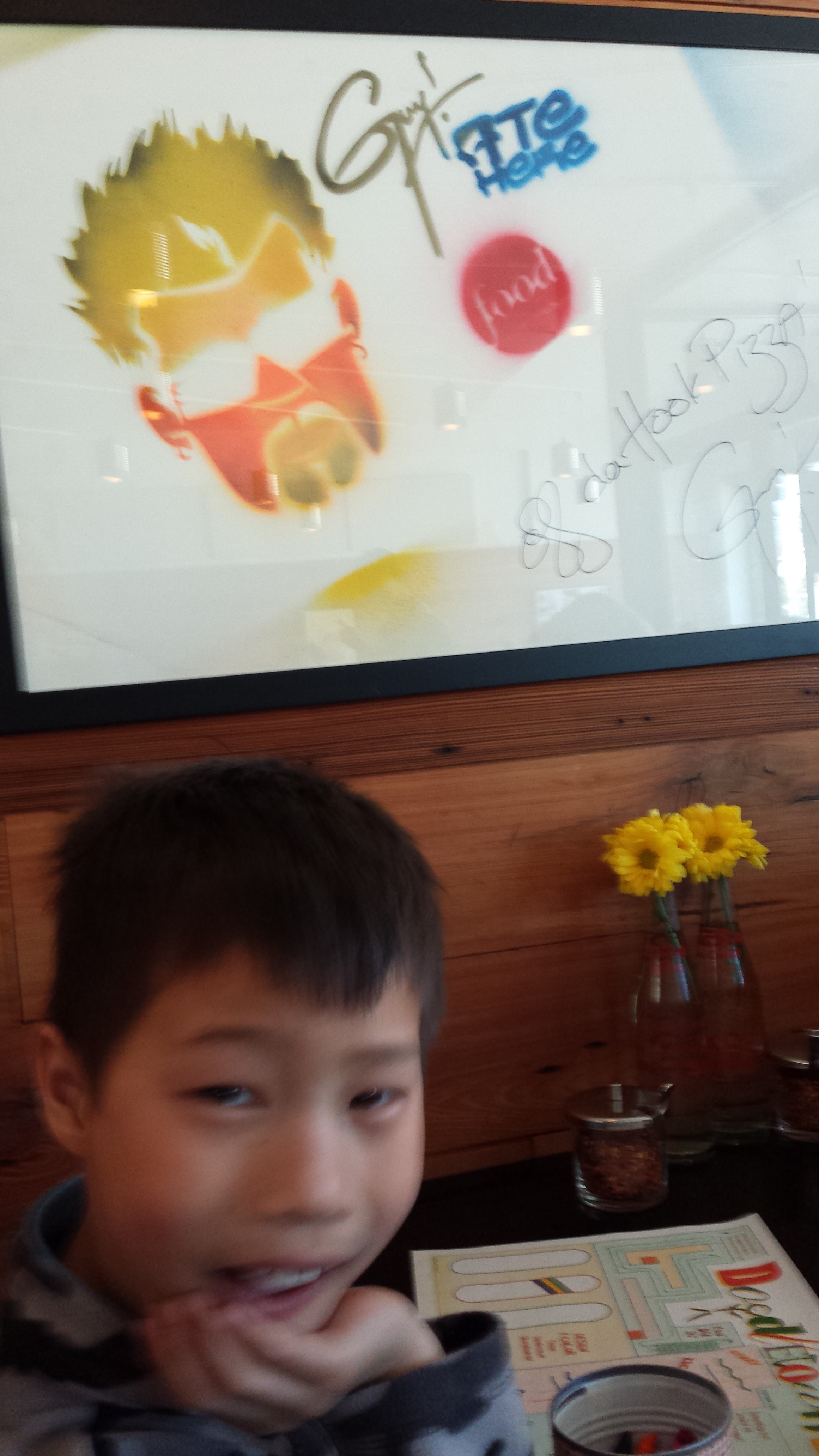Walking in the door, the first thing that hits you is the wall of noise. This is no place for quiet conversation. Perfect ambience for our son, who had no trouble keeping up with the volume. Our wait time was nil (although, from what I understand, that is not always the case). As soon as we were seated, our server arrived with coloring supplies for Austin – a huge plus!